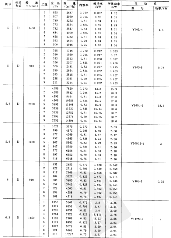 1)本風(fēng)機為單吸入風(fēng)機,機號有No.3.15、3.55、4、4.5、5、5.6、6.3、7.1、8、9、10、11.2、12.5、14等共14個機號組成。